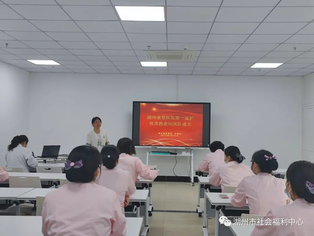 湖州康復(fù)醫(yī)院承擔(dān)多所院校護(hù)理專業(yè)實(shí)習(xí)培訓(xùn),護(hù)理實(shí)習(xí)是培養(yǎng)合格護(hù)理人才的重要環(huán)節(jié),帶教老師則是這一重要環(huán)節(jié)的關(guān)鍵人物,擔(dān)負(fù)著臨床工作和教學(xué)雙重使命。在今年實(shí)習(xí)季即將到來之際,我院選出了16名能力強(qiáng)、有擔(dān)當(dāng)、有責(zé)任心的護(hù)士組成帶教團(tuán)隊(duì),擔(dān)負(fù)實(shí)習(xí)指導(dǎo)工作,以保證培養(yǎng)質(zhì)量,達(dá)到“以教促學(xué),以學(xué)興教,教學(xué)相長”的目的,展現(xiàn)出我院護(hù)理專業(yè)水平,為社會(huì)培養(yǎng)和輸送大量護(hù)理專業(yè)技術(shù)人員,為康復(fù)護(hù)理事業(yè)的蓬勃健康發(fā)展貢獻(xiàn)力量。 副院長陳梅在成立儀式上致辭,她說:“帶教老師是做好教學(xué)實(shí)習(xí)工作的根本保證,在擔(dān)負(fù)傳道、授業(yè)、解惑職責(zé)的同時(shí),不僅要帶教專業(yè)技能,更要在培養(yǎng)護(hù)士職業(yè)道德方面做好標(biāo)桿與引領(lǐng)”。